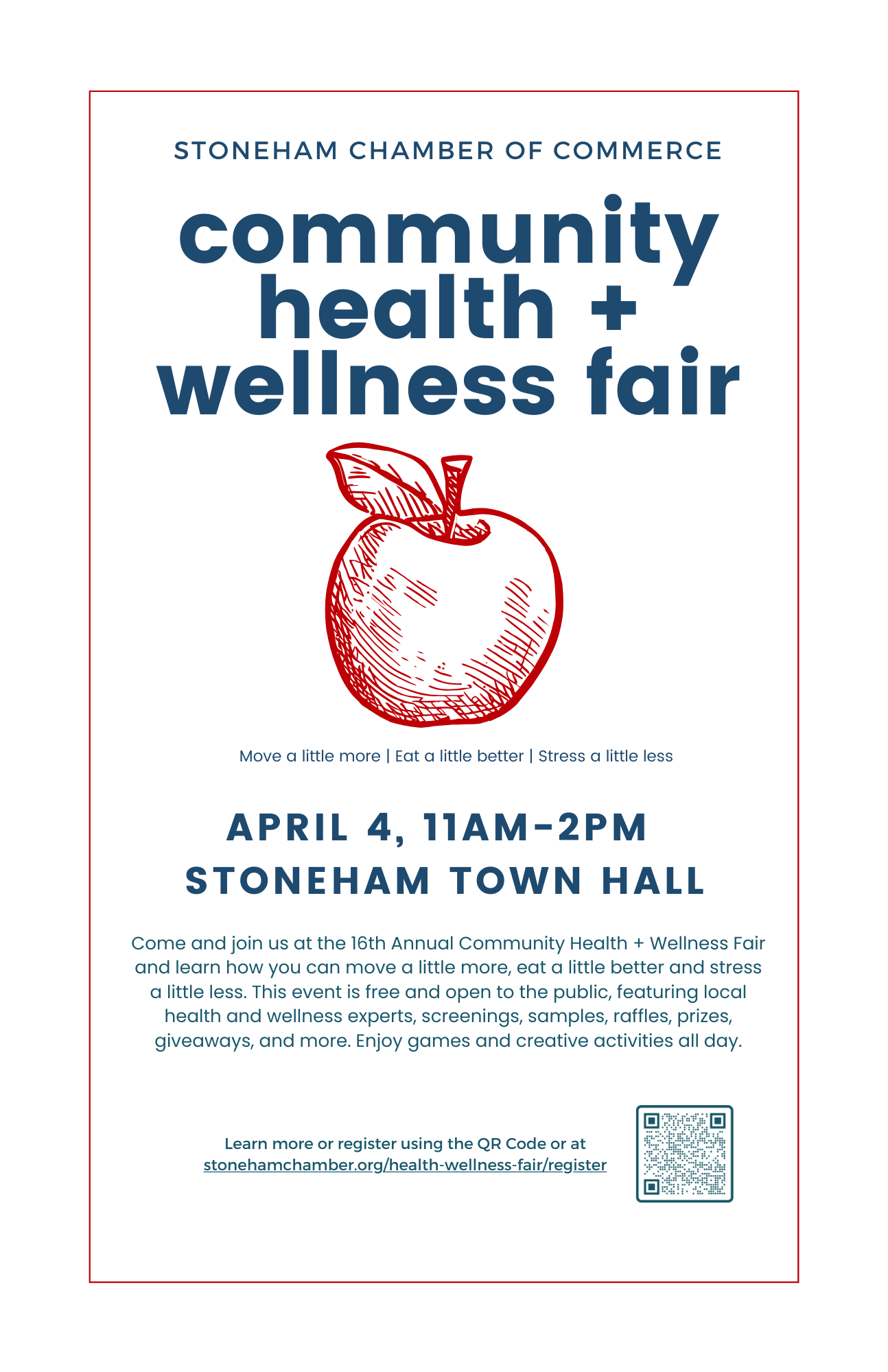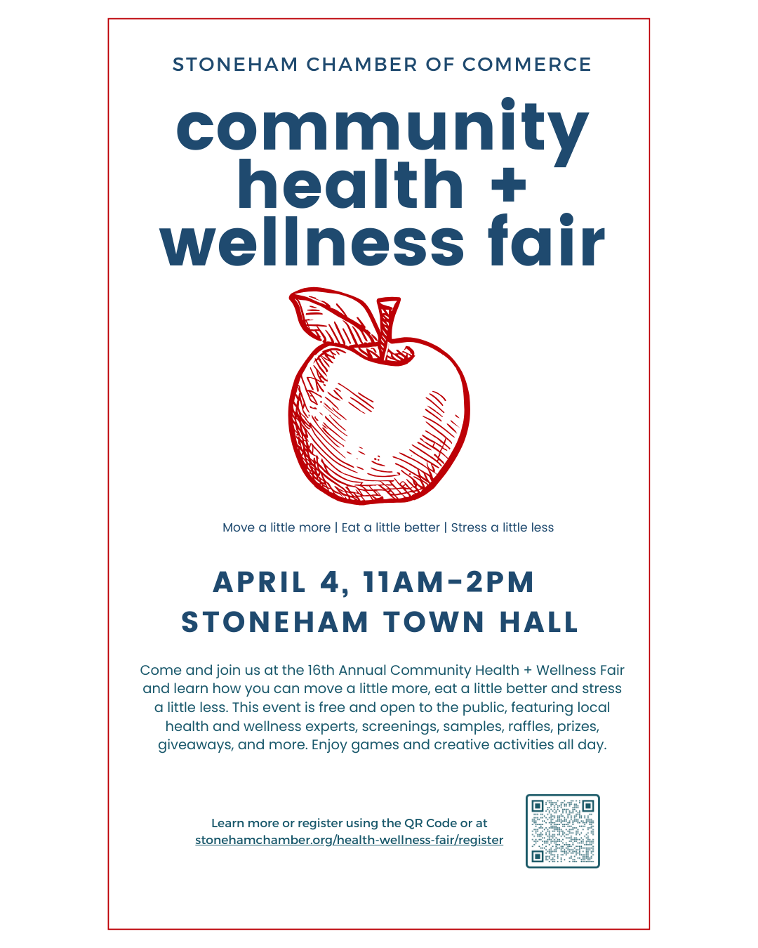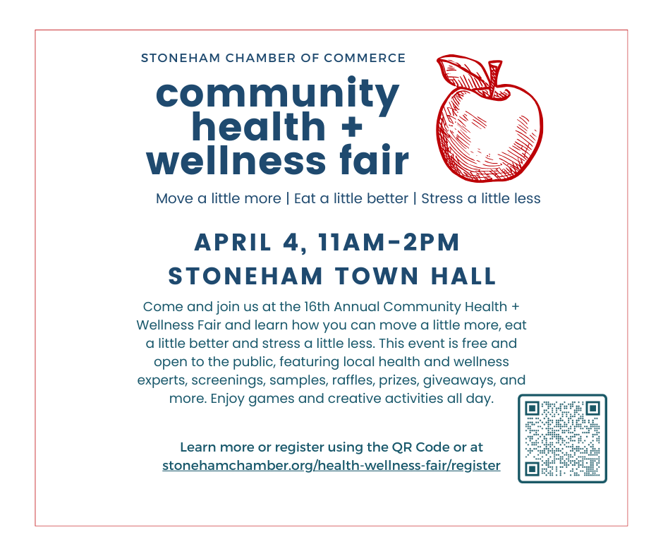 Thank you for registering to be a vendor at the Stoneham Chamber Health + Wellness Fair! We want the day to be a success for your business as you connect with community members, so we’ve included some materials to promote your participation, as well as ideas for making the most of the event.